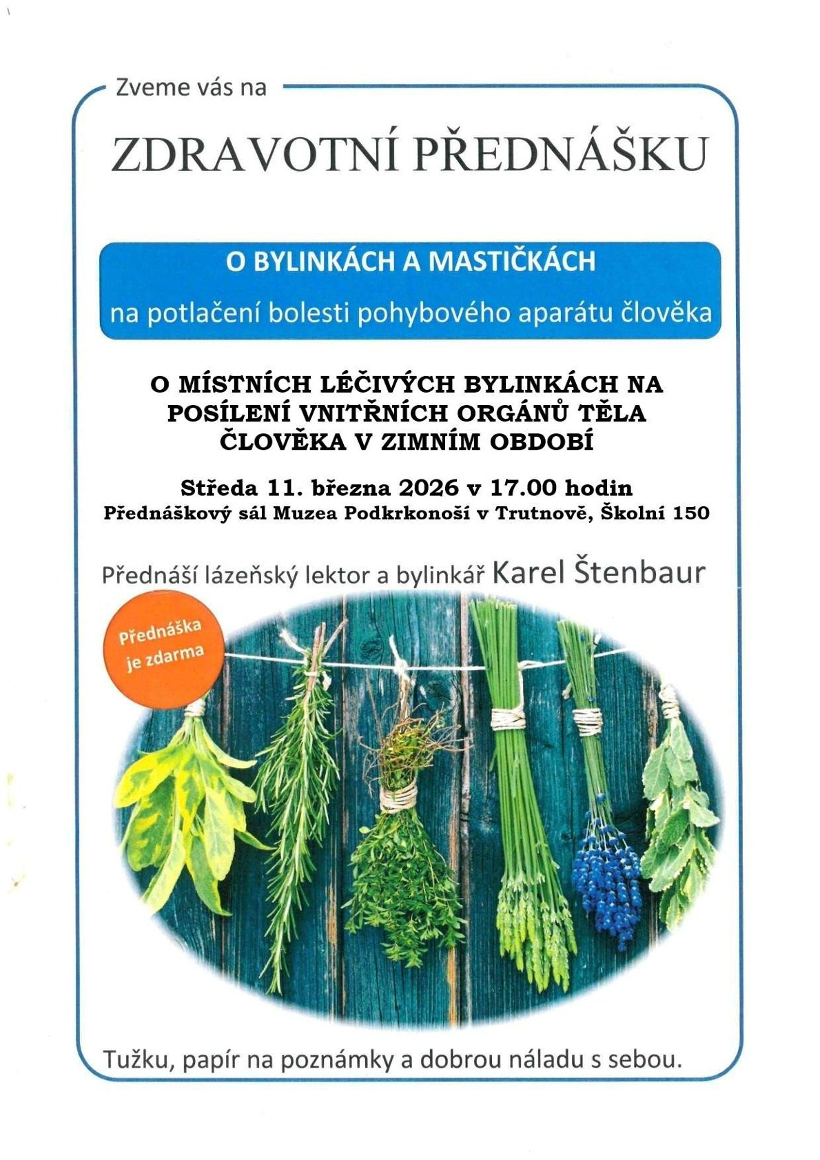 Přednáška se koná ve středu 11. března 2026 v 17.00 hodin v přednáškovém sále Muzea Podkrkonoší v Trutnově. Vstup zdarma. Jste srdečně zváni!
