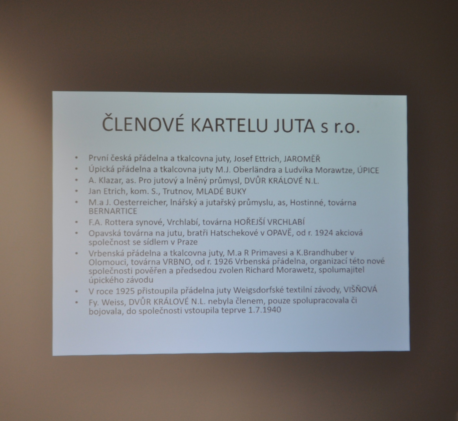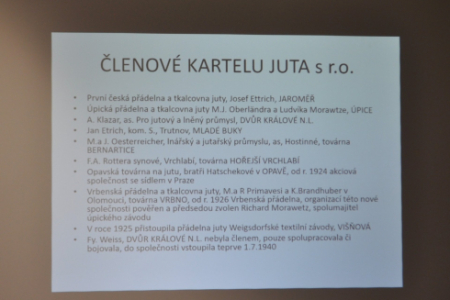 Badatel a znalec historie textilního průmyslu Ing. Josef Jiránek ze Dvora Králové nad Labem se v přednášce věnoval životním osudům zapomenutého textilního podnikatele Julia Löwenbacha (1878–1942). Píše se počátek 30. let 20. století. Éra průmyslové revoluce doznívá a blížící se světová hospodářská krize postupně mění tvář podnikání. Julius Löwenbach, majitel jutařské továrny ve Dvoře Králové nad Labem, se rozhodl využít možností volného trhu a od základu vybudovat prosperující podnik. Tvrdá konkurence a nelítostné ekonomické prostředí jej však brzy semlely. Příběh sleduje, kam až může podnikatele dohnat vztek, pocit bezpráví a odhodlání bránit se… A také ukazuje, jak dlouho může takový zápas trvat.