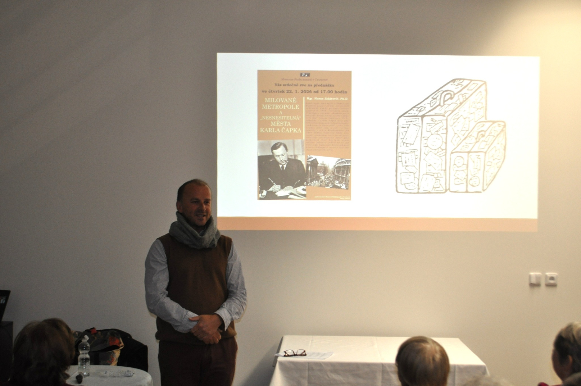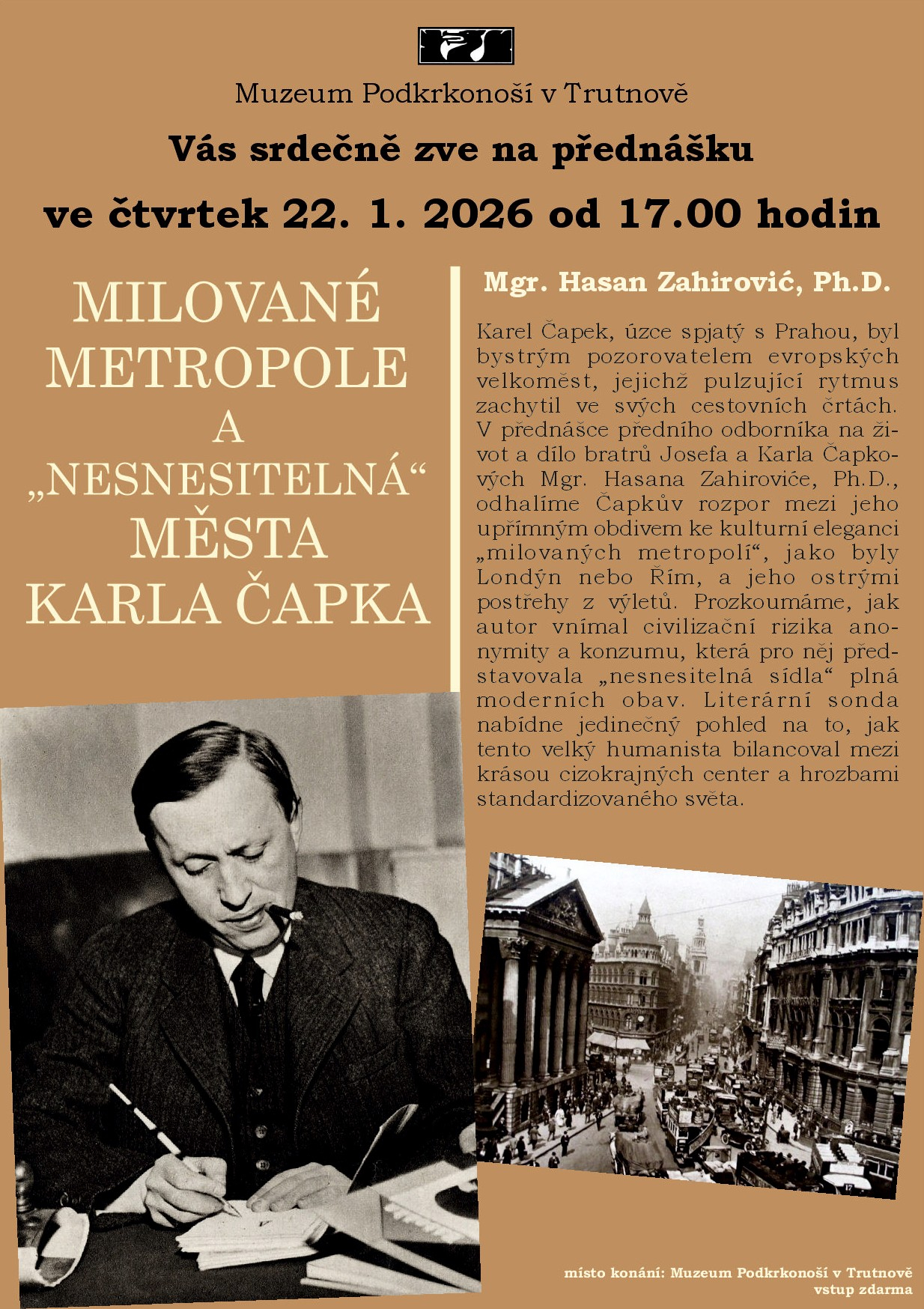 Karel Čapek, úzce spjatý s Prahou, byl bystrým pozorovatelem evropských velkoměst, jejichž pulzující rytmus zachytil ve svých cestovních črtách. V přednášce předního odborníka na život a dílo bratrů Josefa a Karla Čapkových Mgr. Hasana Zahiroviće, Ph.D., odhalíme Čapkův rozpor mezi jeho upřímným obdivem ke kulturní eleganci „milovaných metropolí“, jako byly Londýn nebo Řím, a jeho ostrými postřehy z výletů. Prozkoumáme, jak autor vnímal civilizační rizika anonymity a konzumu, která pro něj představovala „nesnesitelná sídla“ plná moderních obav. Literární sonda nabídne jedinečný pohled na to, jak tento velký humanista bilancoval mezi krásou cizokrajných center a hrozbami standardizovaného světa.