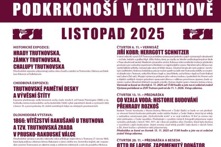 Vážení návštěvníci, na listopad pro Vás máme nachystánu řadu zajímavých akcí. Jednak můžete v našem muzeu navštívit pět dlouhodobých expozic, jednak několik krátkodobých výstav, přičemž zahájíme hned dvě nové u příležitosti 80. výročí ZUŠ Trutnov. První pojedná o historii školy a druhá představí tvorbu jednoho z významných absolventů - sochaře Jiřího Kobra. Dále zazní zajímavé přednášky o budování přehrady Rozkoš na Českoskalicku, která mj. zaplavila některé osady či jejich části, dále o tajemné středověké postavě Ottovi de Lapide (bude spojeno s besedou se současnou trutnovskou kronikářkou) a o trutnovských kronikářích od 16. do 20. století. Těšíme se na Vás!