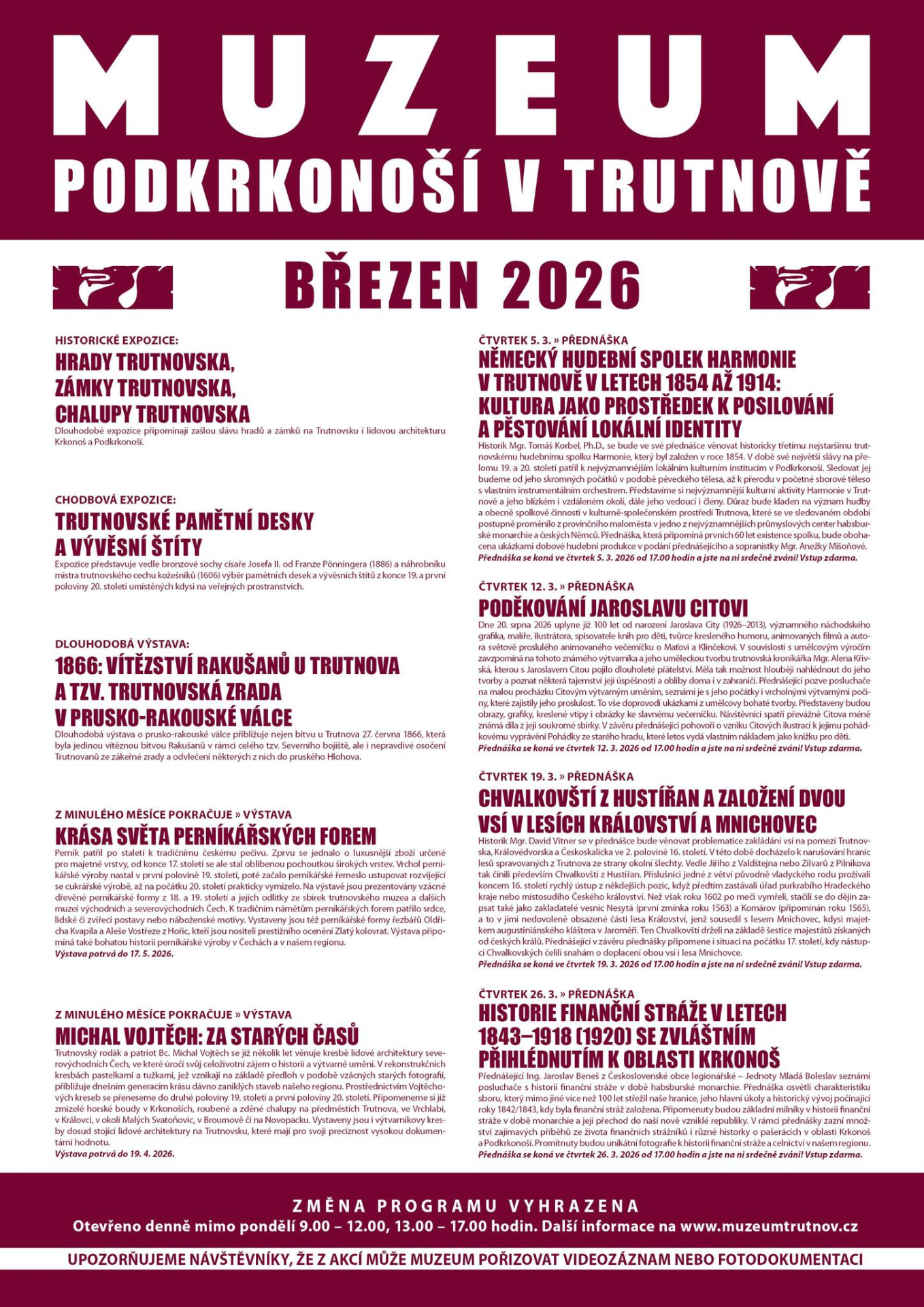 Vážení návštěvníci, přátelé, na březen pro vás máme připraven opět bohatý a pestrý program. Vedle dlouhodobých expozic věnovaných hradům, zámkům a chalupám Trutnovska, válce 1866 a trutnovským pamětním deskám, můžete navštívit poutavé výstavy starých perníkářských forem a kreseb lidové architektury od Michala Vojtěcha. Historik Tomáš Korbel si připravil přednášku o jednom z nejstarších trutnovských spolků, kterým byl hudební spolek Harmonie. Kronikářka Alena Křivská si připravila besedu u příležitosti 100. výročí narození malíře Jaroslava City. V další přednášce se bude historik David Vitner zabývat zakládáním vsí v lesích Království a Mnichovec a rodu Chvalkovských z Hustířan v 16. století. Světem financů a pašeráků na přelomu 19. a 20. století nás provede badatel Jaroslav Beneš, který se zaměří na oblast Krkonoš a Podkrkonoší. Přijďte, těšíme se na Vás!