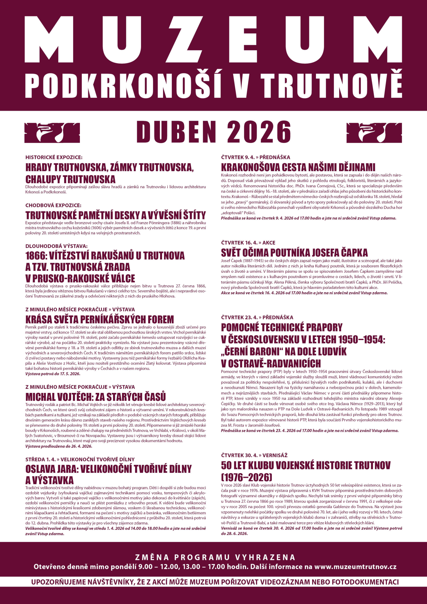 Vážení přátelé, přinášíme Vám přehled výstav a akcí v našem muzeu v dubnu 2026. Program bude zahájen hned prvního dubna velikonočními dílnami (zdobení vajíček, výroba přáníček, pletení pomlázek...) a otevřením malé velikonoční výstavky. Tato výstavka pro Vás bude přístupná zdarma v přízemí muzea až do neděle 12. dubna. Druhý dubnový čtvrtek proběhne přednáška doc PhDr. Ivany Čornejové, CSc., na téma Krakonošova cesta našimi dějinami. Další čtvrtek bude věnován literárnímu pásmu připravenému Společností bratří Čapků na téma Svět očima poutníka Josefa Čapka. Třetí dubnový čtvrtek představí přednášející Václav Němec zajímavou problematiku pomocných technických praporů v bývalém Československu. Konečně poslední čtvrtek bude zasvěcen slavnostnímu otevření výstavy u příležitosti 20. výročí Klubu vojenské historie Trutnov. Jste srdečně zváni, těšíme se na Vás!