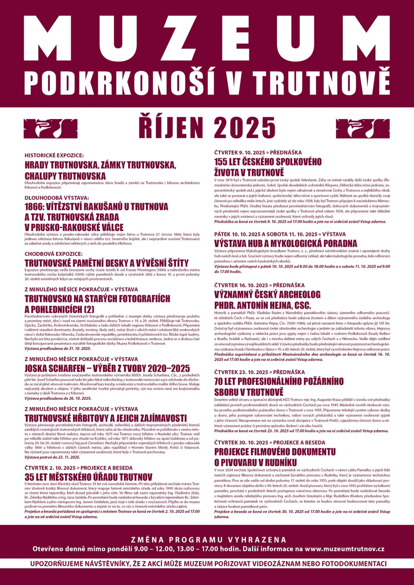 Vážení návštěvníci, na říjen je pro Vás připraven v našem muzeu opět bohatý a pestrý program. Kromě pěti dlouhodobých expozic můžete navštívit též tři krátkodobé výstavy. Připraveny jsou pro všechny zájemce též přednášky a besedy na zajímavá témata u příležitosti několika historických výročí. Těšíme se na Vaši návštěvu!