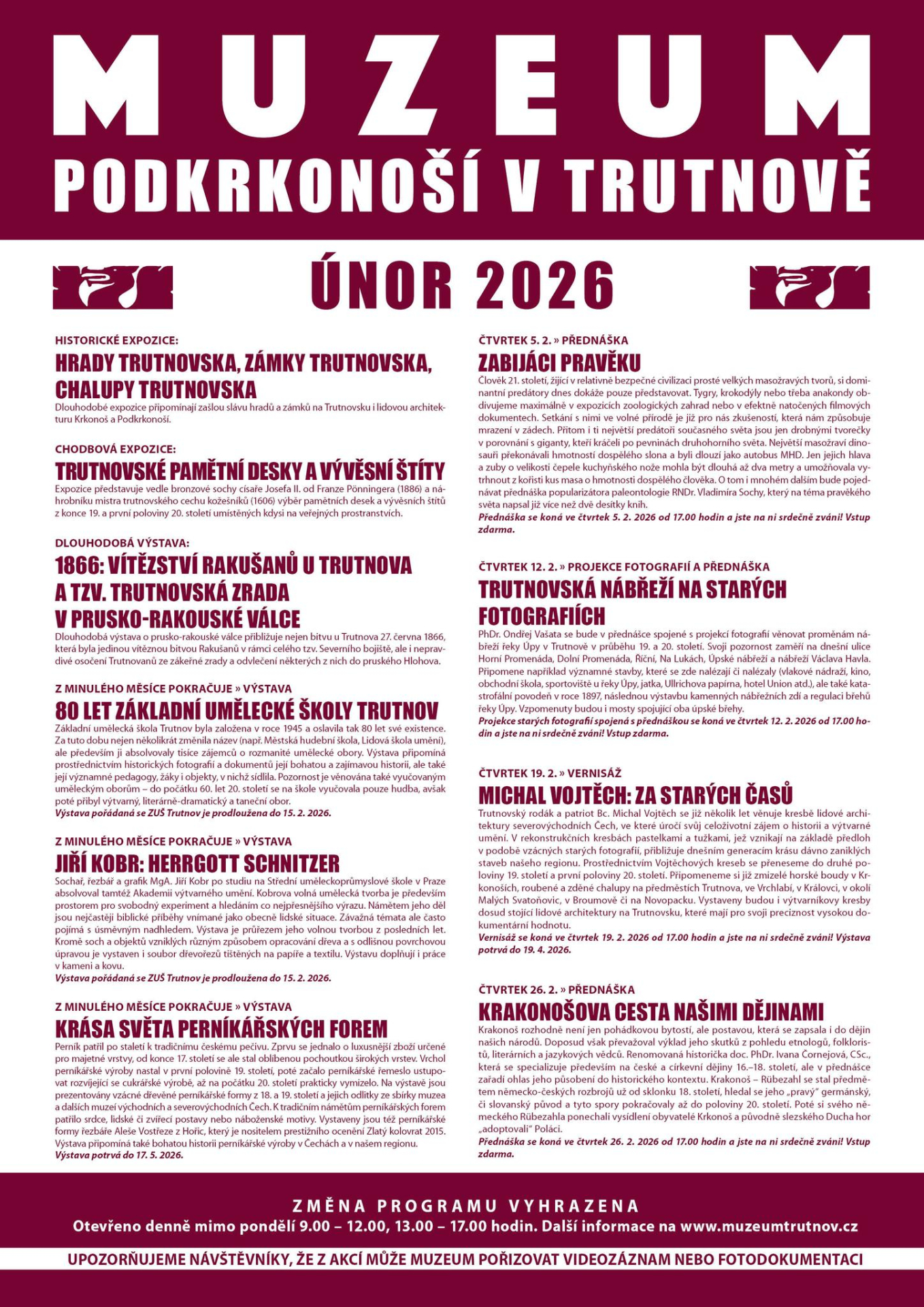 Vážení přátelé, na únor je pro Vás v muzeu připravena řada zajímavých výstav a akcí. Kromě nových výstav perníkářských forem a obrazů krkonošských či podkrkonošských chalup a chaloupek z dílny trutnovského malíře Bc. Michala Vojtěcha se můžete těšit na projekci starých fotografií trutnovských nábřeží v podání PhDr. Ondřeje Vašaty a přednášky RNDr. Vladimíra Sochy o největších masožravých dinosaurech pravěkého světa a doc. PhDr. Ivany Čornejové, CSc., o Krakonošovi v našich dějinách. Přijďte se podívat, těšíme se na Vás.